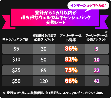 ただし、登録後180日間はウェルカムキャッシュバックがインターショップに存在し続けます。そのため、登録から1ヵ月以上経過した後でも、インターショップでアーリーディールアイテムを見つけた場合は、迷わずそれを利用することが推奨されます。