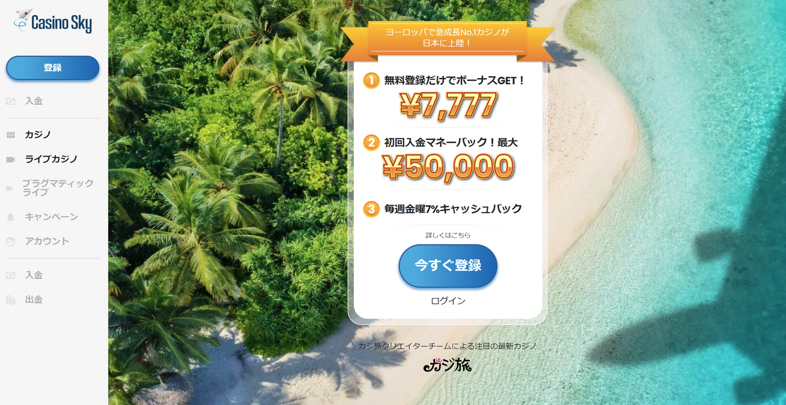 カジノスカイ(Casino Sky)は、2023年11月にリリースされた新規オンラインカジノで、カジ旅やカジノミーの姉妹サイトです。